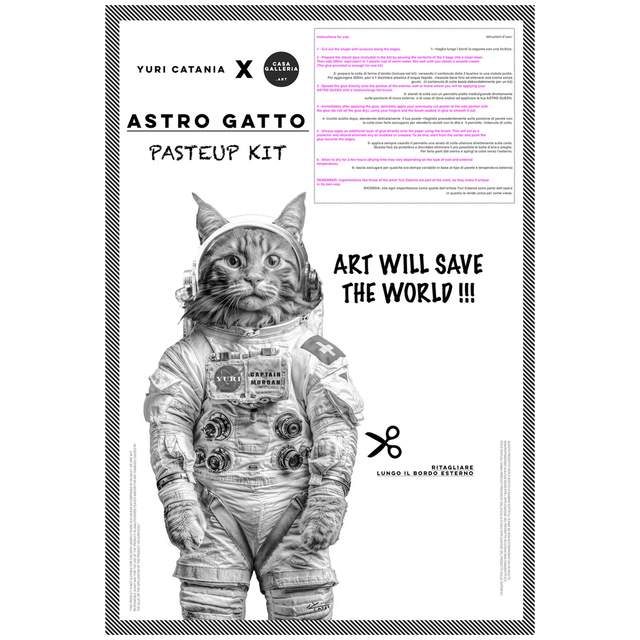 Create your street artwork with the Astro Cat Paste-Up Kit created by Yuri Catania and crafted in tribute to the eponymous artwork displayed at CasaGalleria in Rovio during a workshop with Collège Voltaire from Geneva. This kit includes everything you need: a beautifully designed template of Astro Cat and a small bottle of glue.
